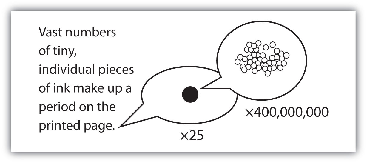 The smallest part of an element that maintains the identity of that element is called an atomThe smallest part of an element that maintains the identity of that element.. Atoms are extremely tiny; to make a line 1 inch long, you would need 217 million iron atoms. The smallest part of a compound that maintains the identity of that compound is called a moleculeThe smallest part of a compound that maintains the identity of that compound.. Molecules are composed of atoms that are attached together and behave as a unit. Scientists usually work with millions and millions of atoms and molecules at a time. When a scientist is working with large numbers of atoms or molecules at a time, the scientist is studying the macroscopicA view of the universe in which one is working with large numbers of atoms or molecules at a time. view of the universe. However, scientists can also describe chemical events on the level of individual atoms or molecules, which is referred to as the microscopicA view of the universe in which one is working with a few atoms or molecules at a time. viewpoint. We will see examples of both macroscopic and microscopic viewpoints throughout this book (Figure 1.3 "How Many Particles Are Needed for a Period in a Sentence?").