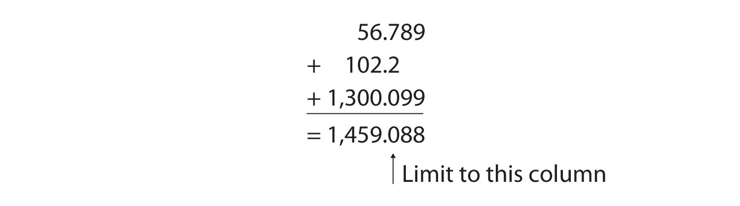 The arrow points to the rightmost column in which all the numbers have significant figures—in this case, the tenths place. Therefore, we will limit our final answer to the tenths place. Is our final answer therefore 1,459.0? No, because when we drop digits from the end of a number, we also have to roundThe process of assessing the final significant figure of a quantity to determine if it should be kept or moved higher. the number. Notice that the second dropped digit, in the hundredths place, is 8. This suggests that the answer is actually closer to 1,459.1 than it is to 1,459.0, so we need to round up to 1,459.1. The rules in rounding are simple: If the first dropped digit is 5 or higher, round up. If the first dropped digit is lower than 5, do not round up.
