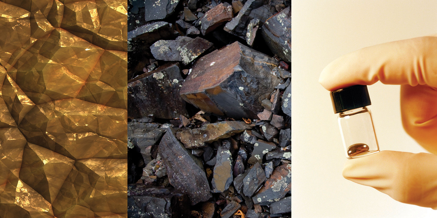 Gold is a yellowish solid, iron is a silvery solid, whle mercury is a silvery liquid at room temperature.
