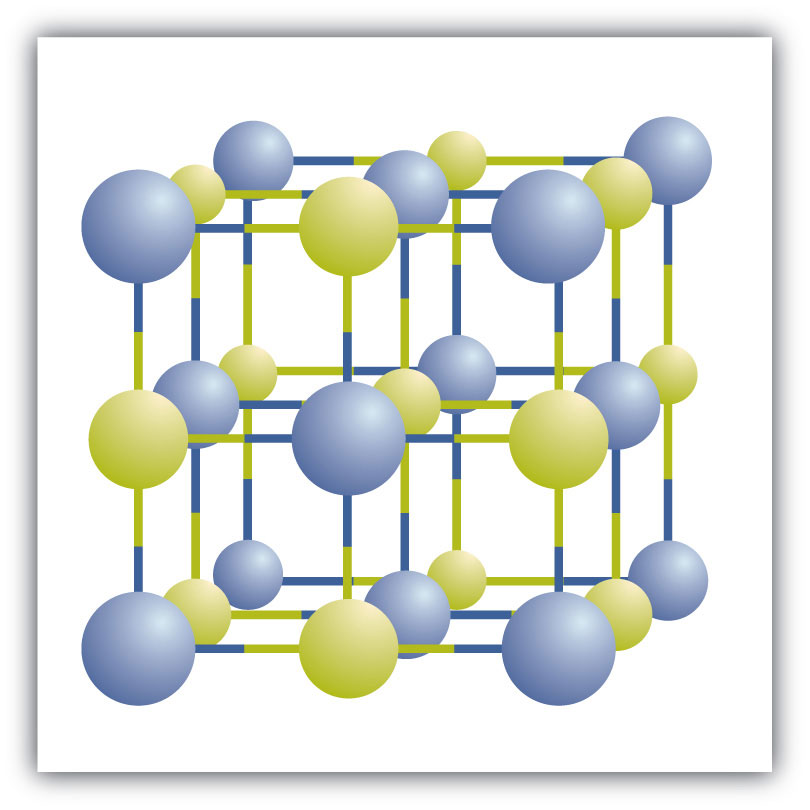 Ionic compounds exist as alternating positive and negative ions in regular, three-dimensional arrays called crystalsA three-dimensional array of alternating positive and negative ions. (Figure 3.6 "A Sodium Chloride Crystal"). As you can see, there are no individual NaCl “particles” in the array; instead, there is a continuous lattice of alternating sodium and chloride ions. However, we can use the ratio of sodium ions to chloride ions, expressed in the lowest possible whole numbers, as a way of describing the compound. In the case of sodium chloride, the ratio of sodium ions to chloride ions, expressed in lowest whole numbers, is 1:1, so we use NaCl (one Na symbol and one Cl symbol) to represent the compound. Thus, NaCl is the chemical formula for sodium chloride, which is a concise way of describing the relative number of different ions in the compound. A macroscopic sample is composed of myriads of NaCl pairs; each pair called a formula unitA set of oppositely charged ions that compose an ionic compound.. Although it is convenient to think that NaCl crystals are composed of individual NaCl units, Figure 3.6 "A Sodium Chloride Crystal" shows that no single ion is exclusively associated with any other single ion. Each ion is surrounded by ions of opposite charge.