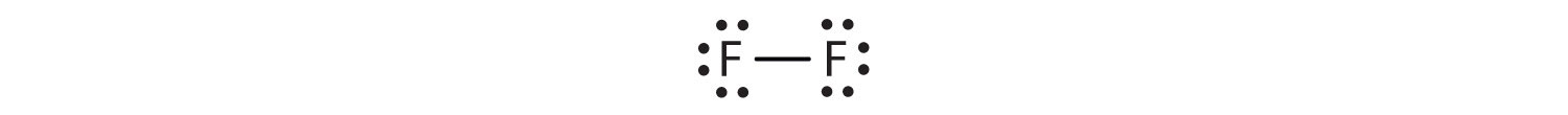 Fluorine is another element whose atoms bond together in pairs to form diatomic (two-atom) molecules. Two separate fluorine atoms have the following electron dot diagrams: