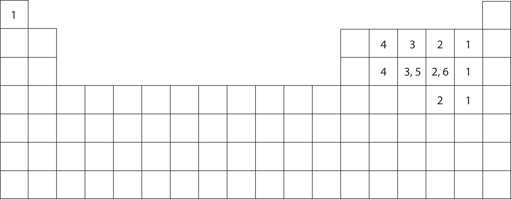 In molecules, there is a pattern to the number of covalent bonds that different atoms can form. Each block with a number indicates the number of covalent bonds formed by that atom in neutral compounds.