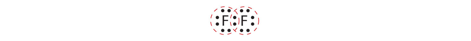 The circles show that each fluorine atom has eight electrons around it. As with hydrogen, we can represent the fluorine molecule with a dash in place of the bonding electrons: