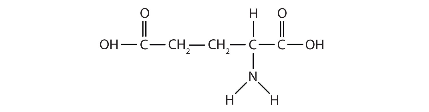 Glutamic acid is the parent compound of monosodium glutamate (known as MSG), which is used as a flavor enhancer. Glutamic acid has the following structure: