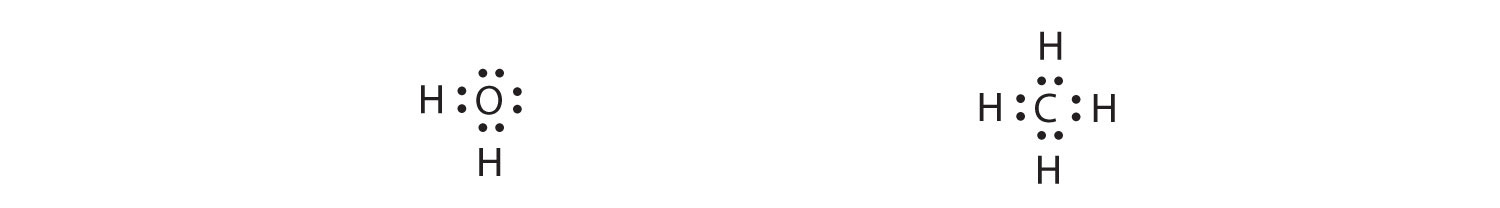 Larger molecules are constructed in a similar fashion, with some atoms participating in more than one covalent bond. For example, water, with two hydrogen atoms and one oxygen atom, and methane (CH4), with one carbon atom and four hydrogen atoms, can be represented as follows: