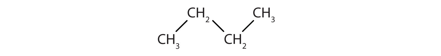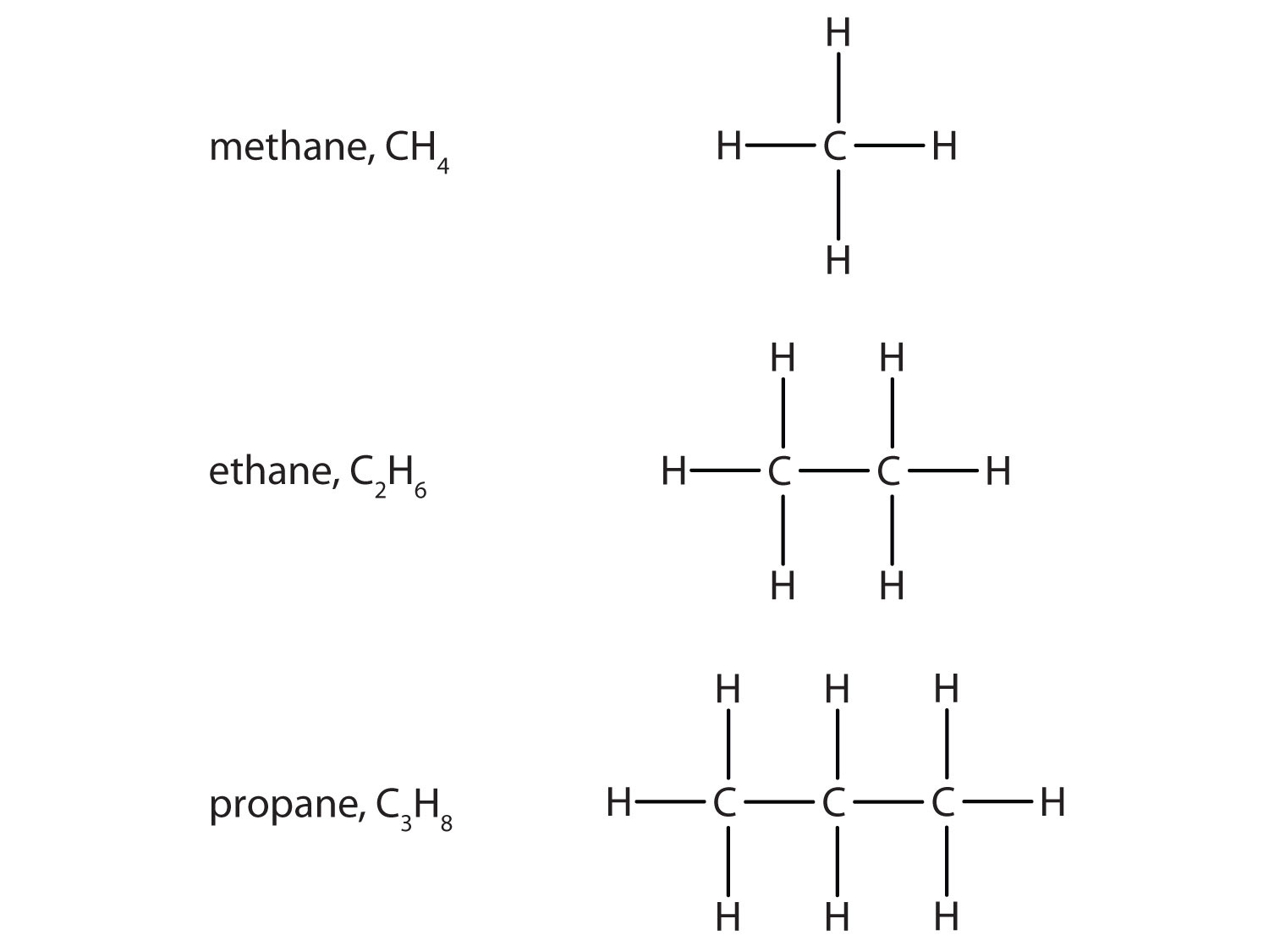 The simplest organic compounds are the hydrocarbonsThe simplest organic compound, composed of carbon and hydrogen atoms only., compounds composed of carbon and hydrogen atoms only. Some hydrocarbons have only single bonds and appear as a chain (which can be a straight chain or can have branches) of carbon atoms also bonded to hydrogen atoms. These hydrocarbons are called alkanes (saturated hydrocarbons)A hydrocarbon with only single covalent bonds and existing as a chain of carbon atoms also bonded to hydrogen atoms.. Each alkane has a characteristic, systematic name depending on the number of carbon atoms in the molecule. These names consist of a stem that indicates the number of carbon atoms in the chain plus the ending -ane. The stem meth- means one carbon atom, so methane is an alkane with one carbon atom. Similarly, the stem eth- means two carbon atoms; ethane is an alkane with two carbon atoms. Continuing, the stem prop- means three carbon atoms, so propane is an alkane with three carbon atoms. Figure 4.6 "Formulas and Molecular Models of the Three Simplest Alkanes" gives the formulas and the molecular models of the three simplest alkanes. (For more information about alkanes, see Chapter 12 "Organic Chemistry: Alkanes and Halogenated Hydrocarbons".)