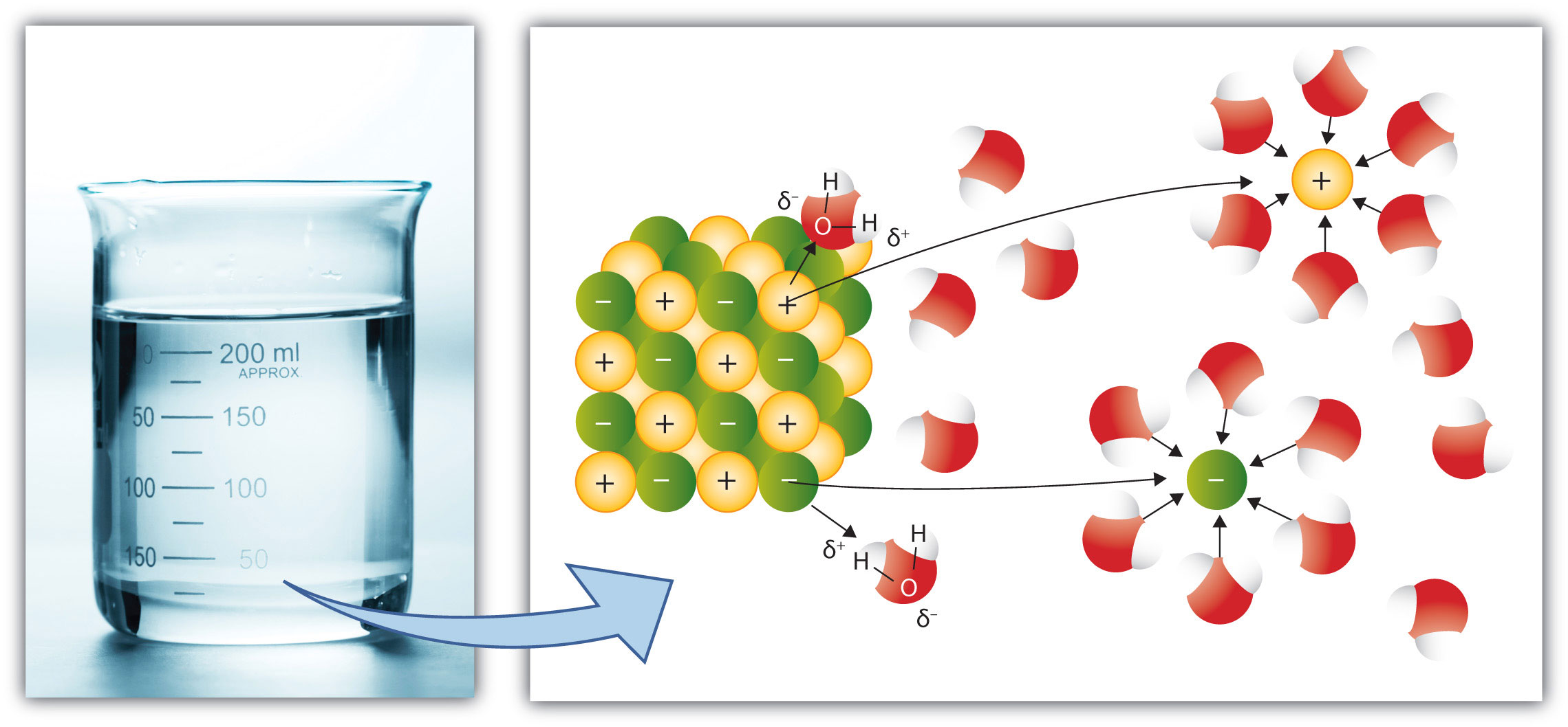 In the case of molecular solutes like glucose, the solute particles are individual molecules. However, if the solute is ionic, the individual ions separate from each other and become surrounded by solvent particles. That is, the cations and anions of an ionic solute separate when the solute dissolves. This process is referred to as dissociationThe process of cations and anions of an ionic solute separating when the solute dissolves.. Compare the dissociation of a simple ionic solute as shown in Figure 9.5 "Ionic Dissociation" to the process illustrated in Figure 9.4 "Solvation".