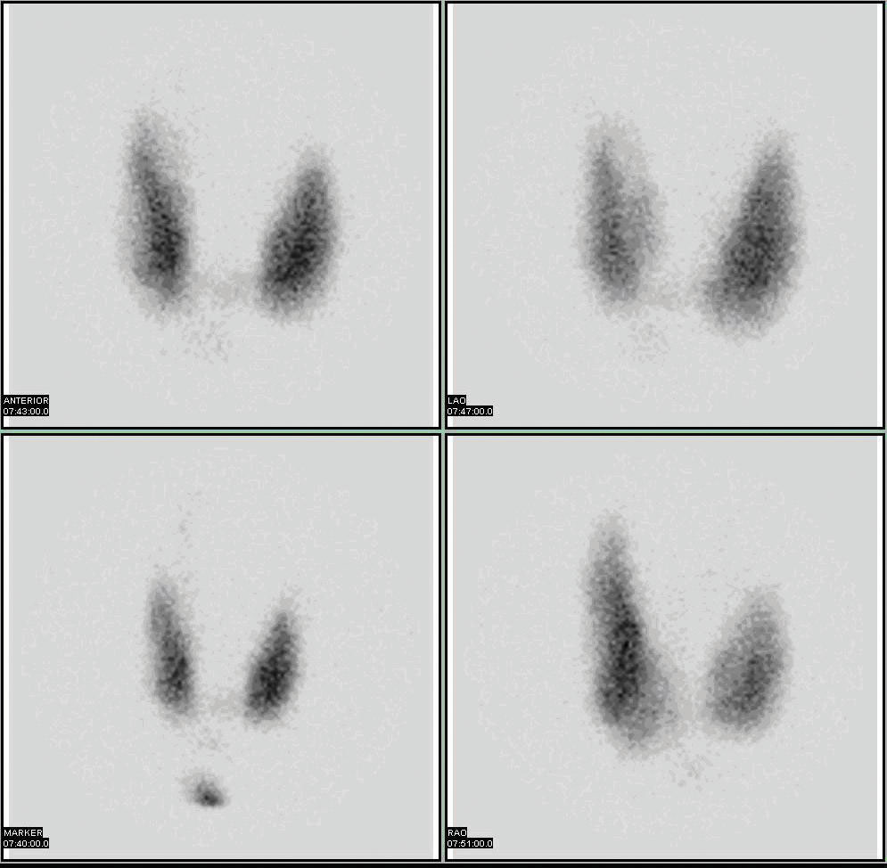 Source: Scan courtesy of Myo Han, http://en.wikipedia.org/wiki/File:Thyroid_scan.jpg.