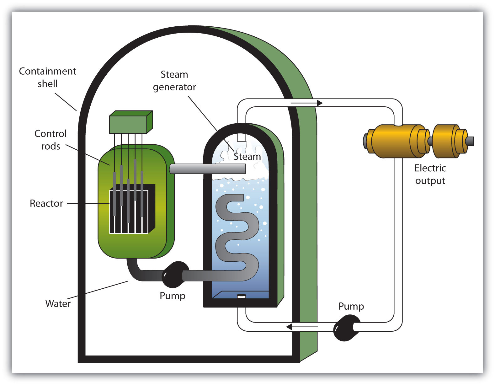 A nuclear reactorAn apparatus designed to carefully control the progress of a nuclear reaction and extract the resulting energy for useful purposes. is an apparatus designed to carefully control the progress of a nuclear reaction and extract the resulting energy for useful purposes. Figure 11.5 "A Diagram of a Nuclear Power Plant for Generating Electricity" shows a simplified diagram of a nuclear reactor. The energy from the controlled nuclear reaction converts liquid water into high-pressure steam, which is used to run turbines that generate electricity.