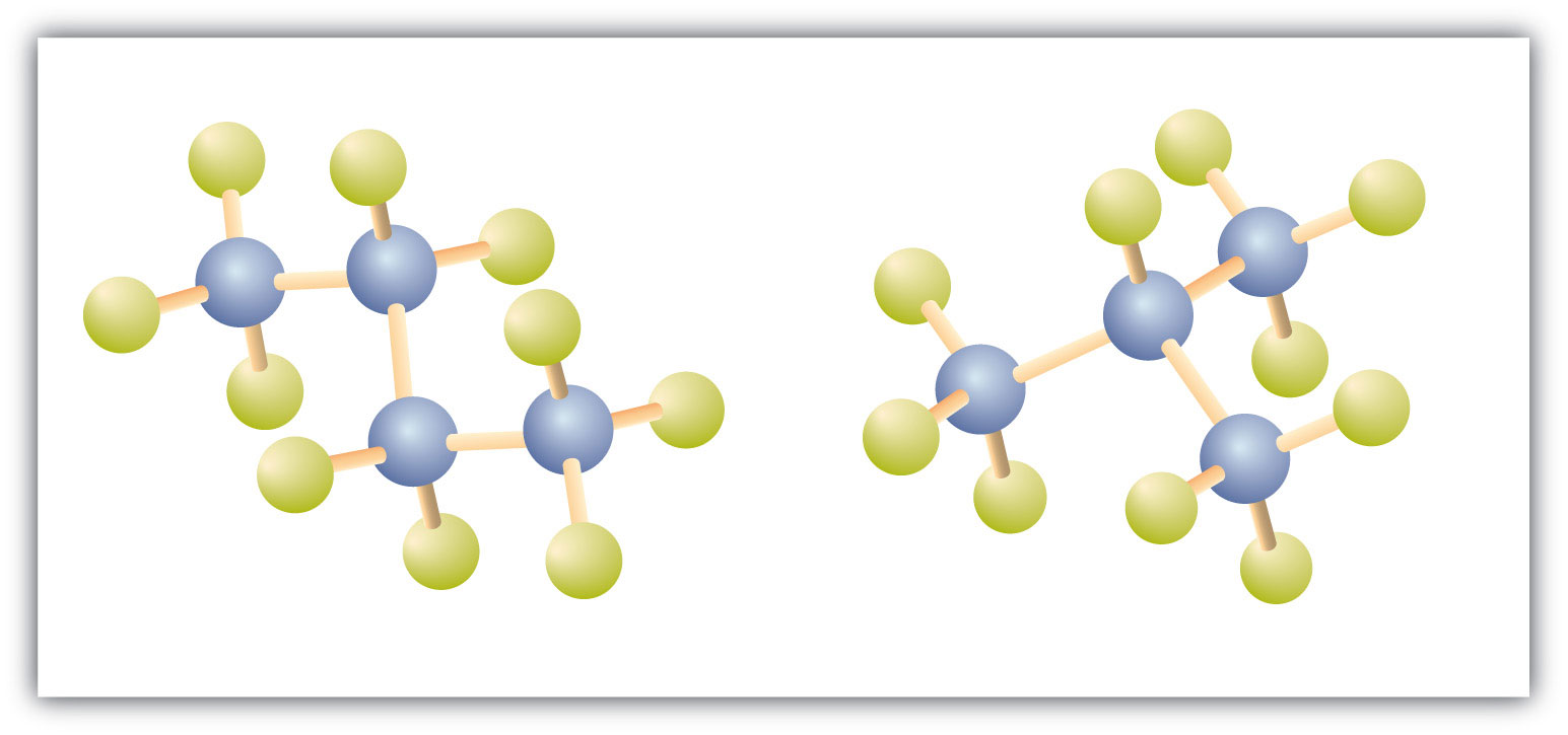 Notice that C4H10 is depicted with a bent chain in Figure 12.4 "Butane and Isobutane". The four-carbon chain may be bent in various ways because the groups can rotate freely about the C–C bonds. However, this rotation does not change the identity of the compound. It is important to realize that bending a chain does not change the identity of the compound; all of the following represent the same compound: