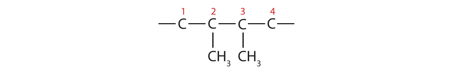 Then add the groups at their proper positions. You can number the parent chain from either direction as long as you are consistent; just don’t change directions before the structure is done. The name indicates two methyl (CH3) groups, one on the second carbon atom and one on the third.