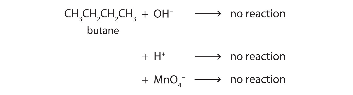 Alkane molecules are nonpolar and therefore generally do not react with ionic compounds such as most laboratory acids, bases, oxidizing agents, or reducing agents. Consider butane as an example: