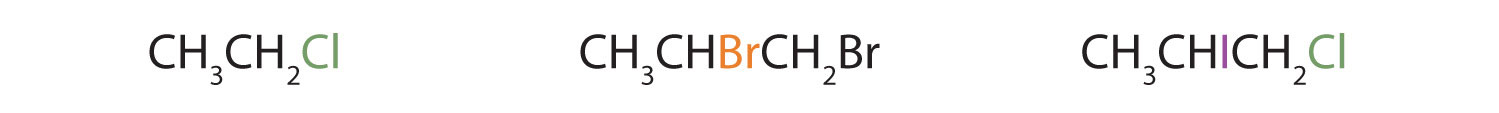 The replacement of only one hydrogen atom gives an alkyl halide (or haloalkane)A compound resulting from the replacement of a hydrogen atom of an alkane with a halogen atom.. The common names of alkyl halides consist of two parts: the name of the alkyl group plus the stem of the name of the halogen, with the ending -ide. The IUPAC system uses the name of the parent alkane with a prefix indicating the halogen substituents, preceded by number indicating the substituent’s location. The prefixes are fluoro-, chloro-, bromo-, and iodo-. Thus CH3CH2Cl has the common name ethyl chloride and the IUPAC name chloroethane. Alkyl halides with simple alkyl groups (one to four carbon atoms) are often called by common names. Those with a larger number of carbon atoms are usually given IUPAC names.