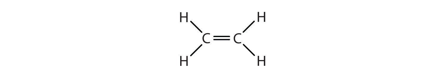 The double bond is shared by the two carbon atoms and does not involve the hydrogen atoms, although the condensed formula does not make this point obvious. Note that the molecular formula for ethene is C2H4, whereas that for ethane is C2H6.