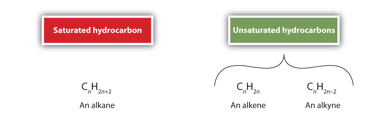 As we noted in Chapter 4 "Covalent Bonding and Simple Molecular Compounds", alkenesA hydrocarbon with one or more carbon–carbon double bonds. are hydrocarbons with carbon-to-carbon double bonds (R2C=CR2) and alkynesA hydrocarbon with a carbon–carbon triple bond. are hydrocarbons with carbon-to-carbon triple bonds (R–C≡C–R). Collectively, they are called unsaturated hydrocarbonsAn alkene or alkyne having one or more multiple (double or triple) bonds between carbon atoms. because they have fewer hydrogen atoms than does an alkane with the same number of carbon atoms, as is indicated in the following general formulas: