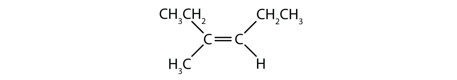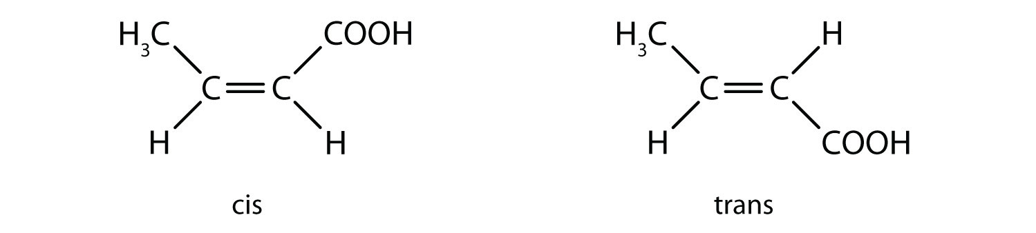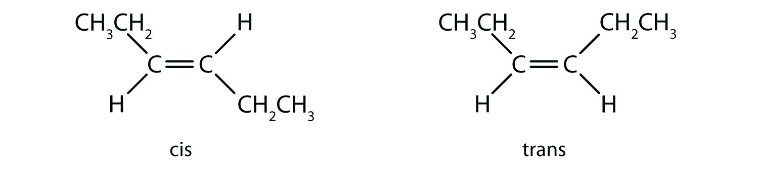 Consider the alkene with the condensed structural formula CH3CH=CHCH3. We could name it 2-butene, but there are actually two such compounds; the double bond results in cis-trans isomerism (Figure 13.3 "Ball-and-Spring Models of (a) Cis-2-Butene and (b) Trans-2-Butene").