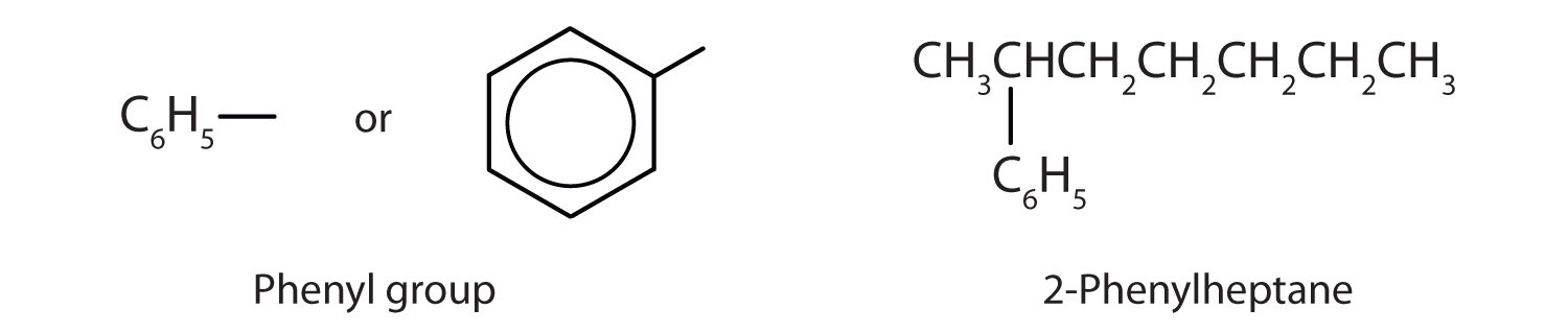 Sometimes an aromatic group is found as a substituent bonded to a nonaromatic entity or to another aromatic ring. The group of atoms remaining when a hydrogen atom is removed from an aromatic compound is called an aryl groupA group derived from an aromatic hydrocarbon by the removal of a hydrogen atom.. The most common aryl group is derived from benzene (C6H6) by removing one hydrogen atom (C6H5) and is called a phenyl group, from pheno, an old name for benzene.