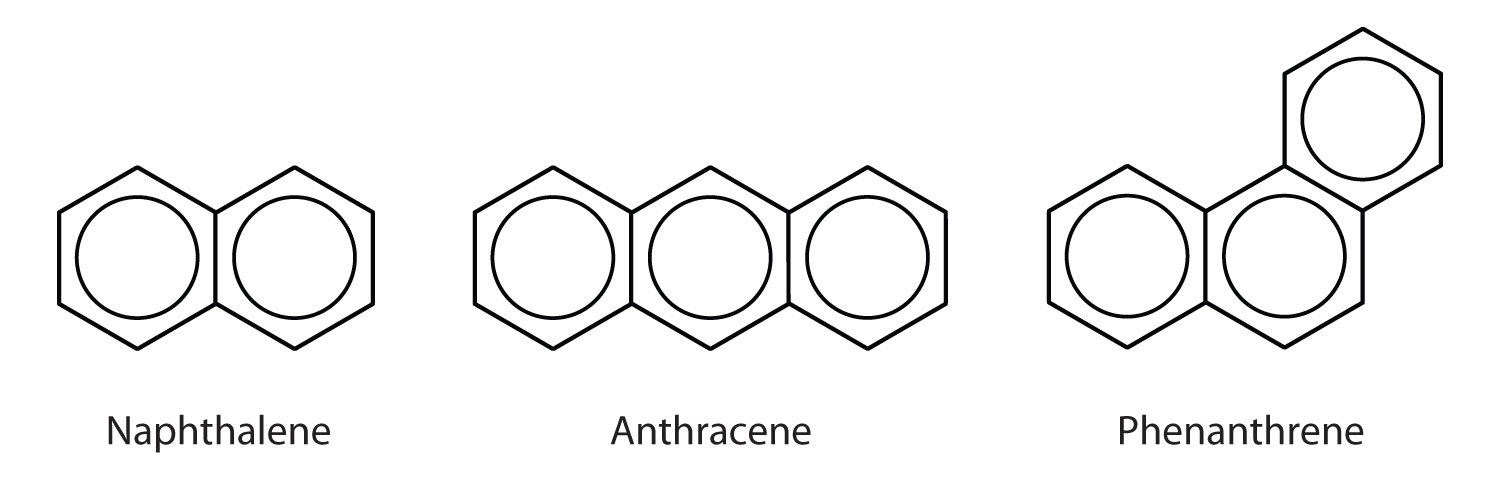 The three examples shown here are colorless, crystalline solids generally obtained from coal tar. Naphthalene has a pungent odor and is used in mothballs. Anthracene is used in the manufacture of certain dyes. Steroids, a large group of naturally occurring substances, contain the phenanthrene structure. (For more information about steroids, see Chapter 17 "Lipids", Section 17.4 "Steroids".)