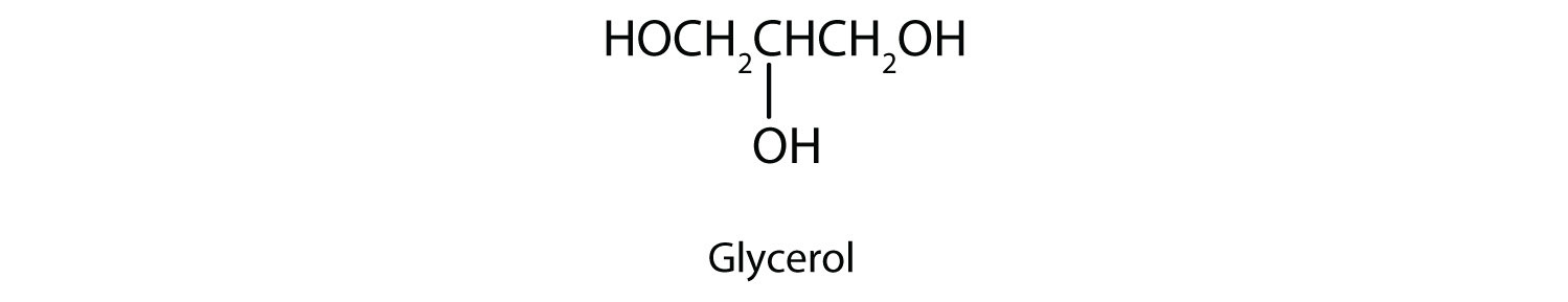 Commonly called glycerol or glycerin, 1,2,3-propanetriol is the most important trihydroxy alcohol. Like the two glycols, it is a sweet, syrupy liquid. Glycerol is a product of the hydrolysis of fats and oils. (For more information about fats and oils, see Chapter 17 "Lipids", Section 17.2 "Fats and Oils".)