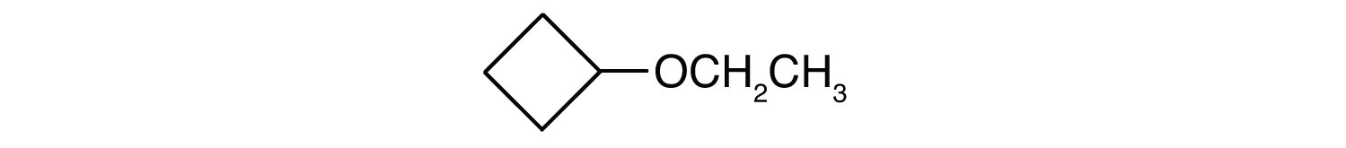 Ether molecules have no hydrogen atom on the oxygen atom (that is, no OH group). Therefore there is no intermolecular hydrogen bonding between ether molecules, and ethers therefore have quite low boiling points for a given molar mass. Indeed, ethers have boiling points about the same as those of alkanes of comparable molar mass and much lower than those of the corresponding alcohols (Table 14.4 "Comparison of Boiling Points of Alkanes, Alcohols, and Ethers").