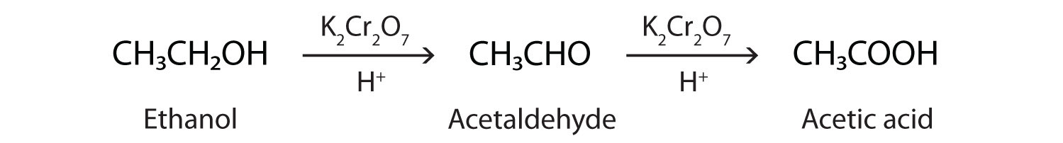 In the presence of an oxidizing agent, ethanol is oxidized to acetaldehyde, which is then oxidized to acetic acid.