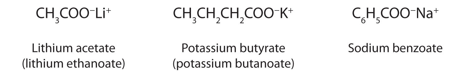 Carboxylic acid salts are named in the same manner as inorganic salts: the name of the cation is followed by the name of the organic anion. The name of the anion is obtained by dropping the -ic ending of the acid name and replacing it with the suffix -ate. This rule applies whether we are using common names or International Union of Pure and Applied Chemistry (IUPAC) names: