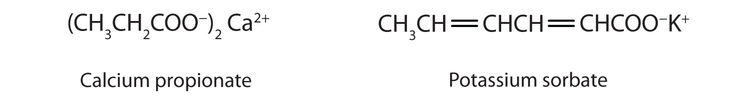 Some organic salts are used as preservatives in food products. They prevent spoilage by inhibiting the growth of bacteria and fungi. Calcium and sodium propionate, for example, are added to processed cheese and bakery goods; sodium benzoate is added to cider, jellies, pickles, and syrups; and sodium sorbate and potassium sorbate are added to fruit juices, sauerkraut, soft drinks, and wine. Look for them on ingredient labels the next time you shop for groceries.