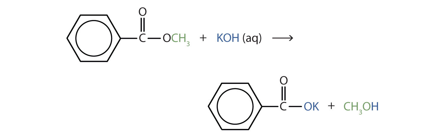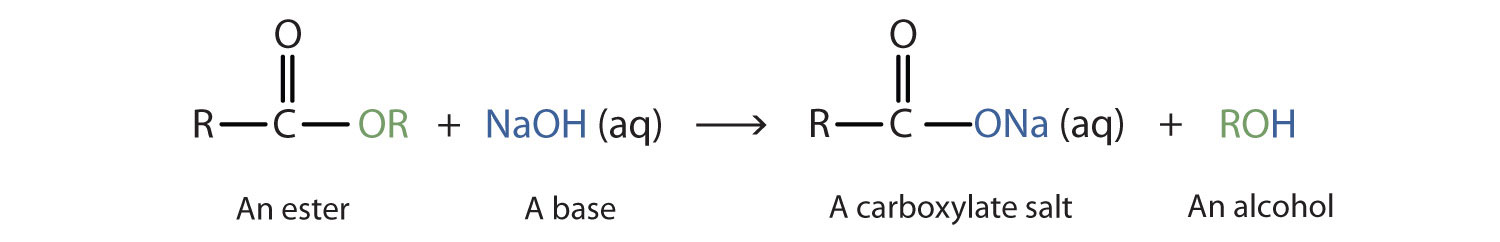 When a base (such as sodium hydroxide [NaOH] or potassium hydroxide [KOH]) is used to hydrolyze an ester, the products are a carboxylate salt and an alcohol. Because soaps are prepared by the alkaline hydrolysis of fats and oils, alkaline hydrolysis of esters is called saponificationThe hydrolysis of fats and oils in the presence of a base to make soap. (Latin sapon, meaning “soap,” and facere, meaning “to make”). In a saponification reaction, the base is a reactant, not simply a catalyst. The reaction goes to completion: