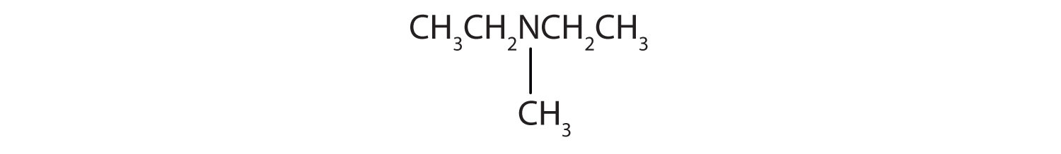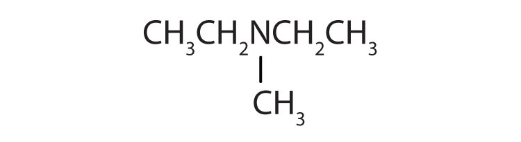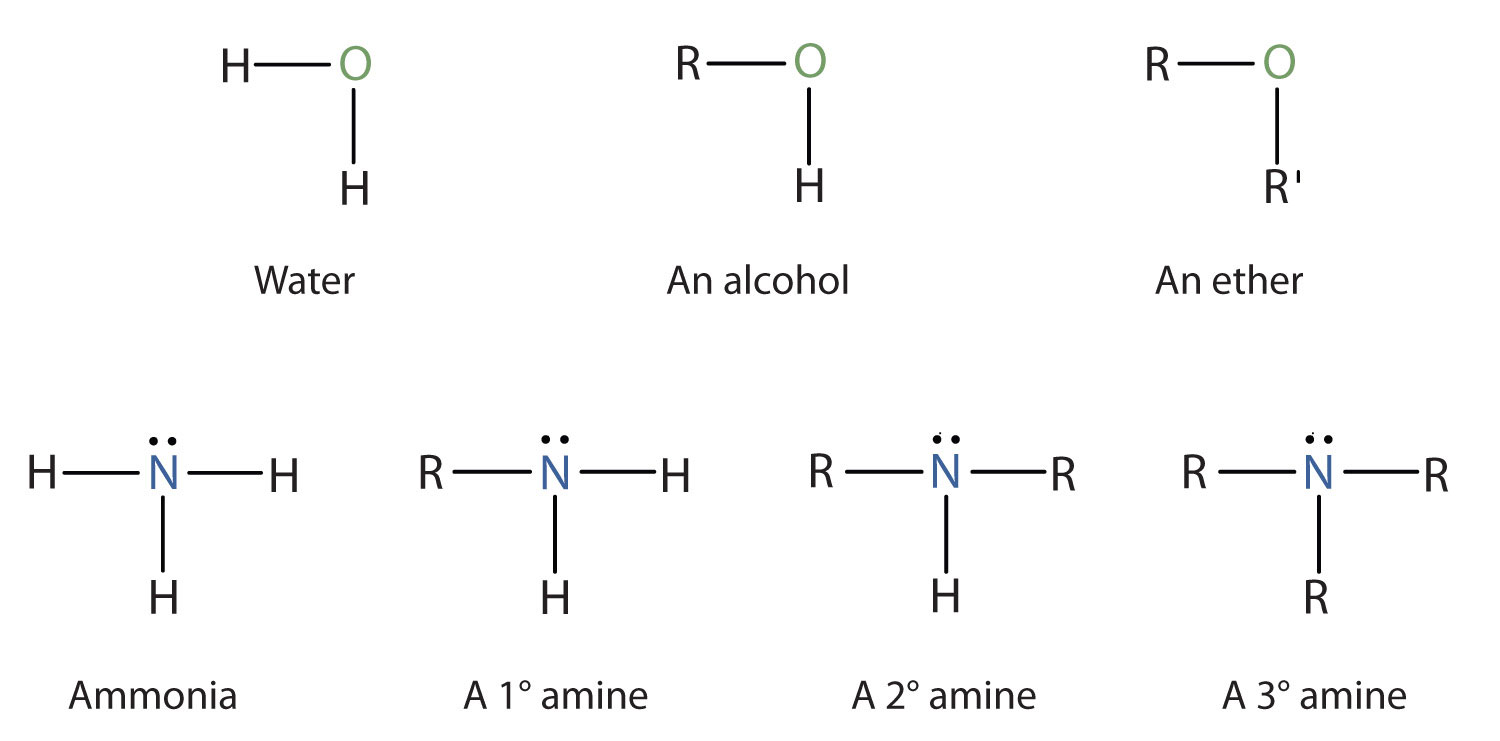 Amines are classified according to the number of carbon atoms bonded directly to the nitrogen atom. A primary (1°) amineA compound that has only one alkyl or aryl group on the nitrogen atom. has one alkyl (or aryl) group on the nitrogen atom, a secondary (2°) amineA compound that has two alkyl or aryl groups on the nitrogen atom. has two, and a tertiary (3°) amineA compound that has three alkyl or aryl groups on the nitrogen atom. has three (Figure 15.5 "The Structure of Amines Compared to Water, an Alcohol, and an Ether").