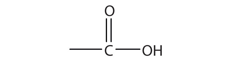 A carboxylic acidAn organic compound that has a carboxyl group. is an organic compound that has a carboxyl groupA functional group that contains a carbon–oxygen bond and an OH group also attached to the same carbon atom.. The carboxyl group is a functional group that contains a carbon–oxygen double bond and an OH group also attached to the same carbon atom, but it has characteristic properties of its own. As with aldehydes and ketones, carboxylic acid formulas can be written to show the carbon-to-oxygen double bond explicitly, or the carboxyl group can be written in condensed form on one line. In general, carboxylic acids are represented by the formula RCOOH, where R is a hydrocarbon group.