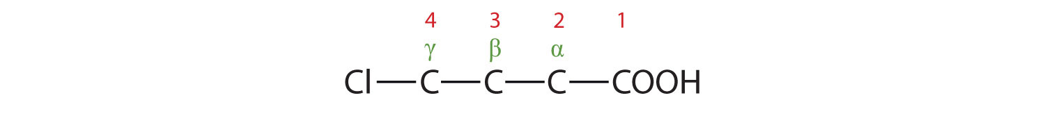 The common names of carboxylic acids use Greek letters (α, β, γ, δ, and so forth), not numbers, to designate the position of substituent groups in acids. These letters refer to the position of the carbon atom in relation to the carboxyl carbon atom.