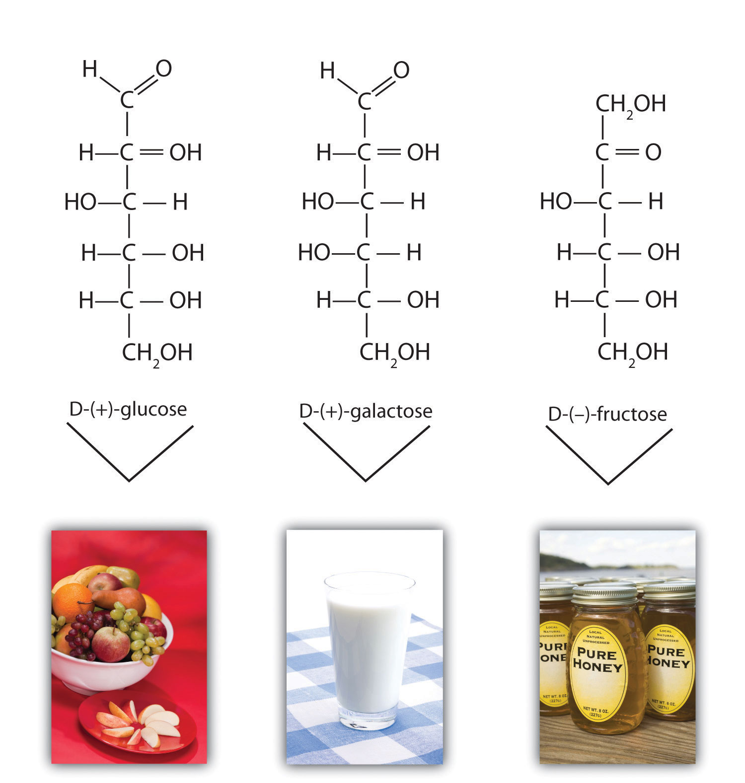 Although a variety of monosaccharides are found in living organisms, three hexoses are particularly abundant: D-glucose, D-galactose, and D-fructose (Figure 16.4 "Structures of Three Important Hexoses"). Glucose and galactose are both aldohexoses, while fructose is a ketohexose.