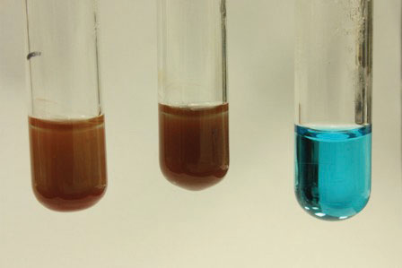 Benedict’s test was performed on three carbohydrates, depicted from left to right: fructose, glucose, and sucrose. The solution containing sucrose remains blue because sucrose is a nonreducing sugar.