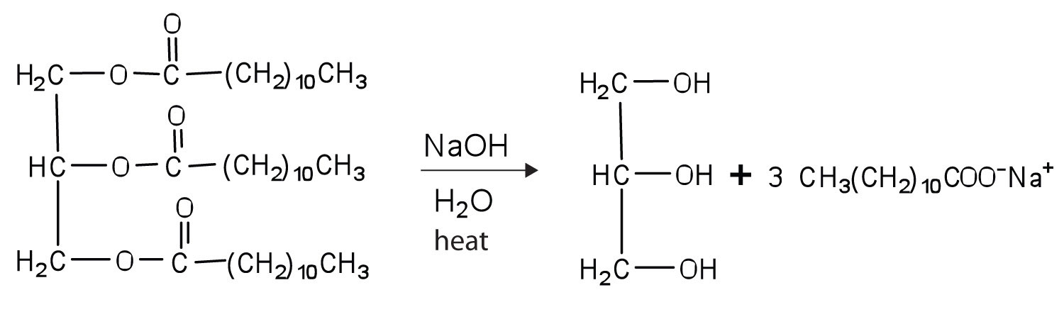 Draw structures to write the reaction for the hydrolysis of trilaurin in a basic solution (see Table 17.1 "Some Common Fatty Acids Found in Natural Fats" for the condensed structure of lauric acid).