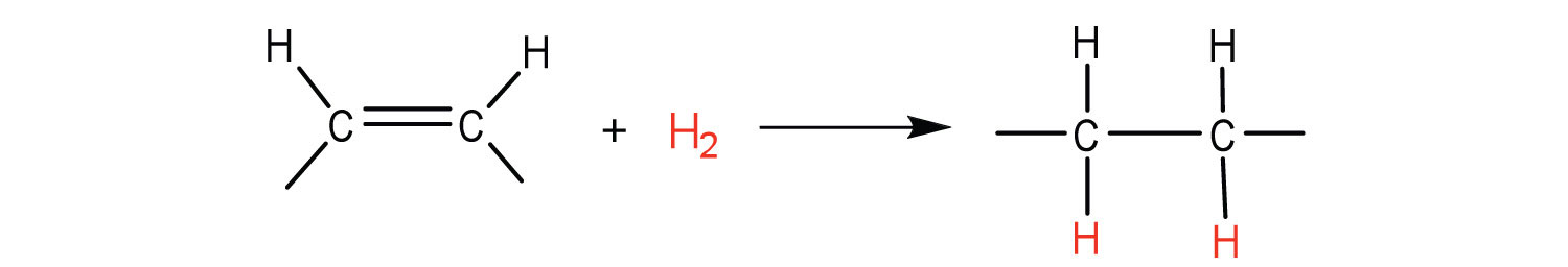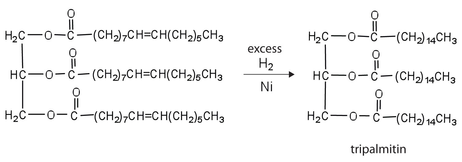 The double bonds in fats and oils can undergo hydrogenation and also oxidation. The hydrogenation of vegetable oils to produce semisolid fats is an important process in the food industry. Chemically, it is essentially identical to the catalytic hydrogenation reaction described for alkenes in Chapter 13 "Unsaturated and Aromatic Hydrocarbons", Section 13.4 "Chemical Properties of Alkenes".