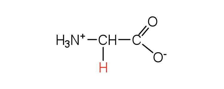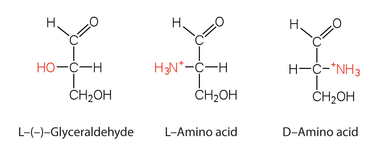 Notice in Table 18.2 "Common Amino Acids Found in Proteins" that glycine is the only amino acid whose α-carbon is not chiral. Therefore, with the exception of glycine, the amino acids could theoretically exist in either the D- or the L-enantiomeric form and rotate plane-polarized light. As with sugars, chemists use glyceraldehyde as the reference compound for the assignment of configuration to amino acids. (For more information about stereoisomers and configuration, see Chapter 16 "Carbohydrates", Section 16.2 "Classes of Monosaccharides".) Its structure closely resembles an amino acid structure except that in the latter, an amino group takes the place of the OH group on the chiral carbon of the sugar.