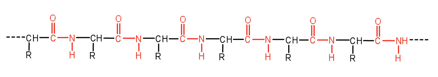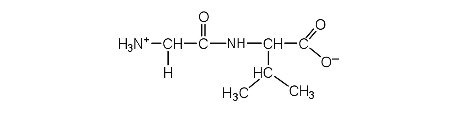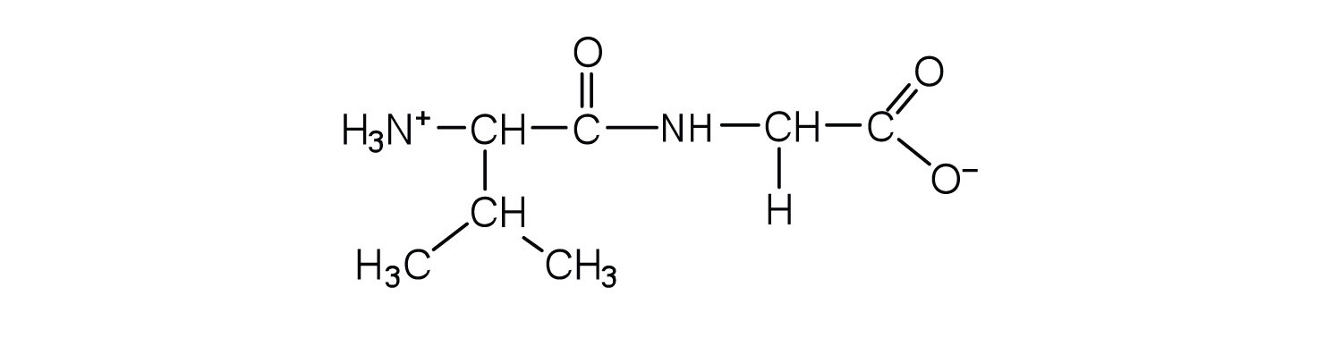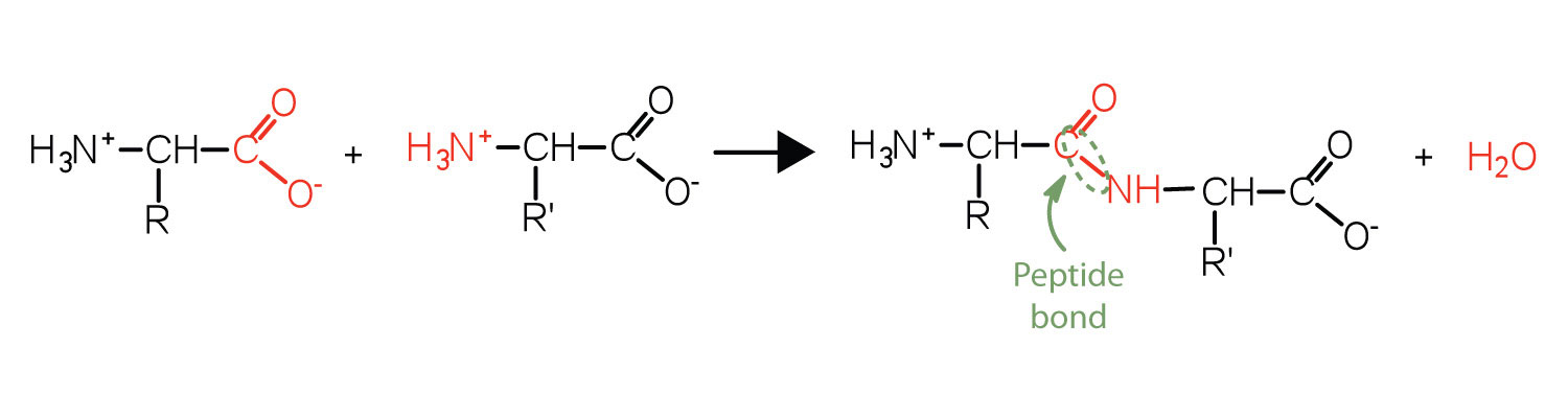 Two or more amino acids can join together into chains called peptides. In Chapter 15 "Organic Acids and Bases and Some of Their Derivatives", Section 15.16 "Formation of Amides", we discussed the reaction between ammonia and a carboxylic acid to form an amide. In a similar reaction, the amino group on one amino acid molecule reacts with the carboxyl group on another, releasing a molecule of water and forming an amide linkage:
