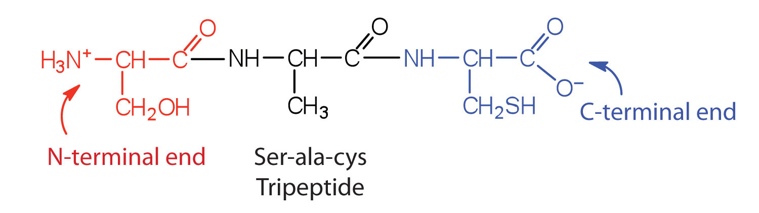 A chain consisting of only two amino acid units is called a dipeptide; a chain consisting of three is a tripeptide. By convention, peptide and protein structures are depicted with the amino acid whose amino group is free (the N-terminal end) on the left and the amino acid with a free carboxyl group (the C-terminal end) to the right.