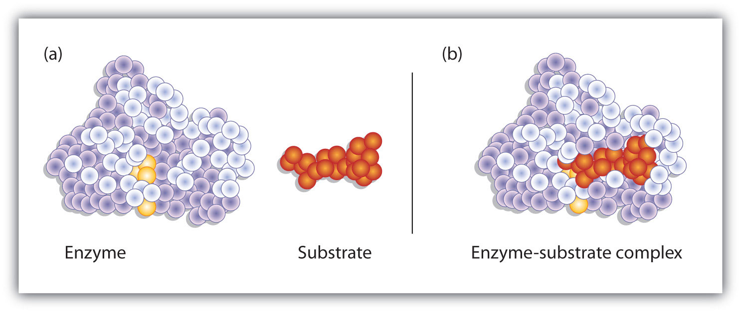 (a) Because the substrate and the active site of the enzyme have complementary structures and bonding groups, they fit together as a key fits a lock. (b) The catalytic reaction occurs while the two are bonded together in the enzyme-substrate complex.