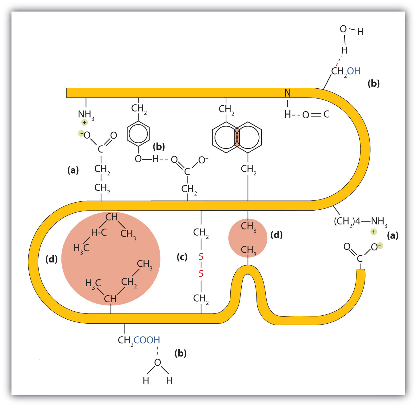 Four types of intramolecular and intermolecular forces contribute to secondary, tertiary, and quaternary structure: (1) hydrogen bonding between an oxygen or a nitrogen atom and a hydrogen atom bound to an oxygen atom or a nitrogen atom, either on the same chain or on a neighboring chain; (2) ionic bonding between one positively charged side chain and one negatively charged side chain; (3) disulfide linkages between cysteine units; and (4) dispersion forces between nonpolar side chains.