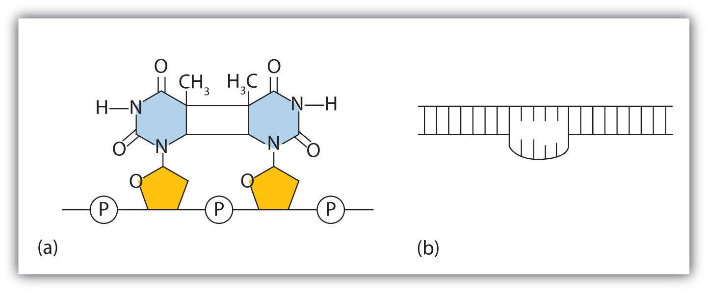 (a) The thymine dimer is formed by the action of UV light. (b) When a defect in the double strand is produced by the thymine dimer, this defect temporarily stops DNA replication, but the dimer can be removed, and the region can be repaired by an enzyme repair system.