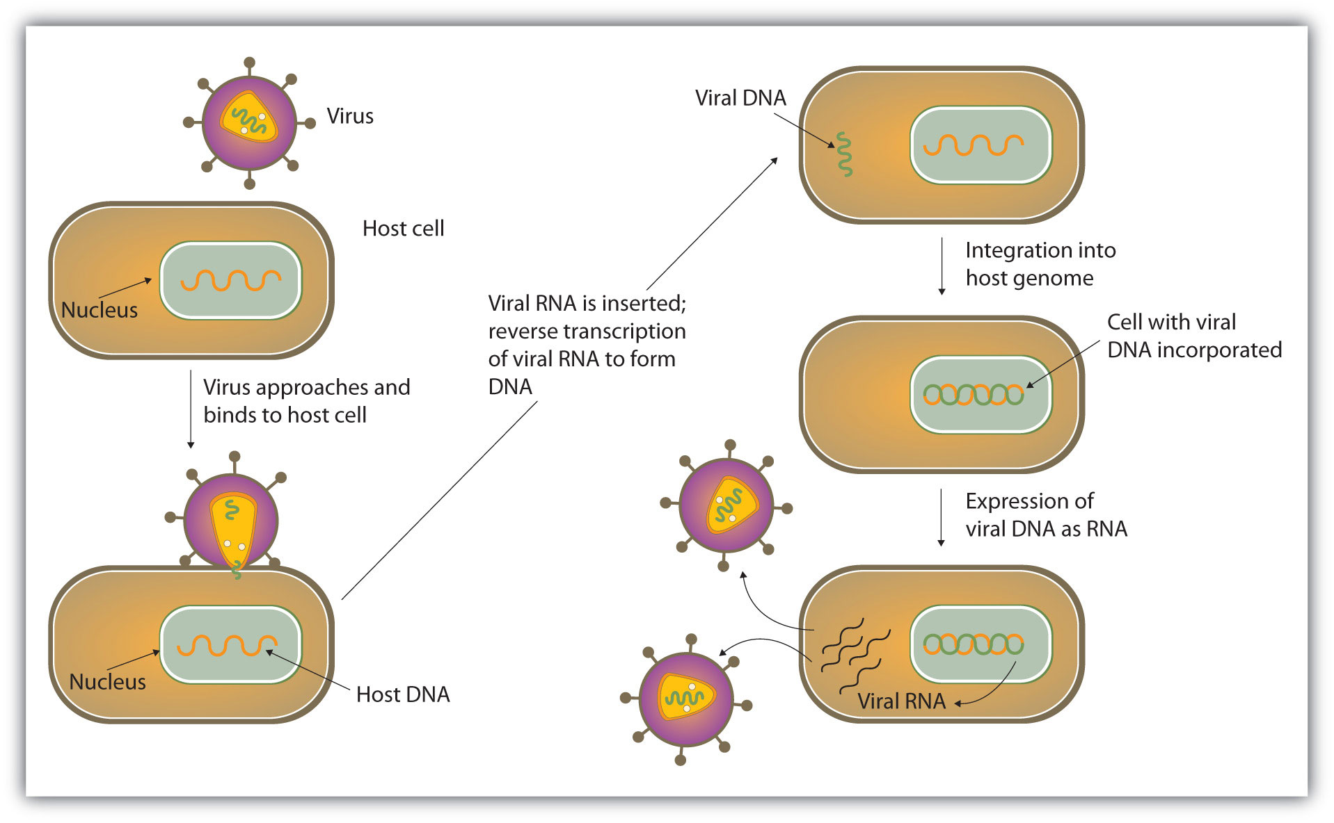 Most RNA viruses use their nucleic acids in much the same way as the DNA viruses, penetrating a host cell and inducing it to replicate the viral RNA and synthesize viral proteins. The new RNA strands and viral proteins are then assembled into new viruses. Some RNA viruses, however, called retrovirusesAn RNA virus that directs the synthesis of a DNA copy in the host cell. (Figure 19.18 "Life Cycle of a Retrovirus"), synthesize DNA in the host cell, in a process that is the reverse of the DNA-to-RNA transcription that normally occurs in cells. (See Figure 19.10 "A Schematic Diagram of RNA Transcription from a DNA Template" for the transcription process.) The synthesis of DNA from an RNA template is catalyzed by the enzyme reverse transcriptase.