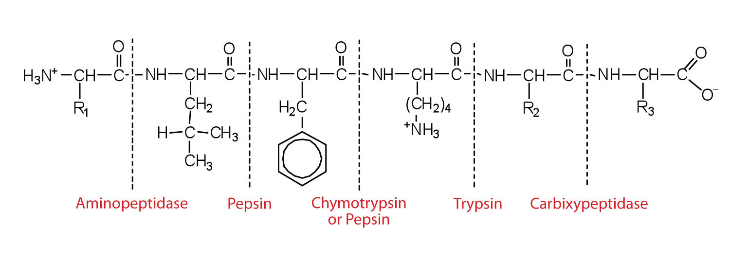 This diagram illustrates where in a peptide the different peptidases we have discussed would catalyze hydrolysis the peptide bonds.