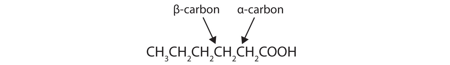 Draw the structure of hexanoic (caproic) acid and identify the α-carbon and the β-carbon.