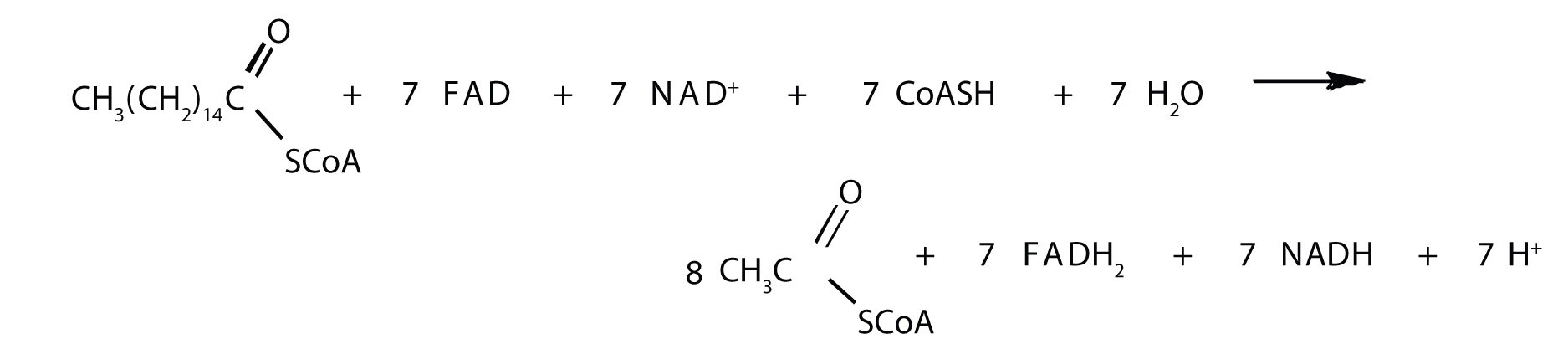 The shortened fatty acyl-CoA is then degraded by repetitions of these four steps, each time releasing a molecule of acetyl-CoA. The overall equation for the β-oxidation of palmitoyl-CoA (16 carbon atoms) is as follows: