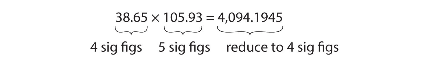 For multiplication or division, the rule is to count the number of significant figures in each number being multiplied or divided and then limit the significant figures in the answer to the lowest count. An example is as follows: