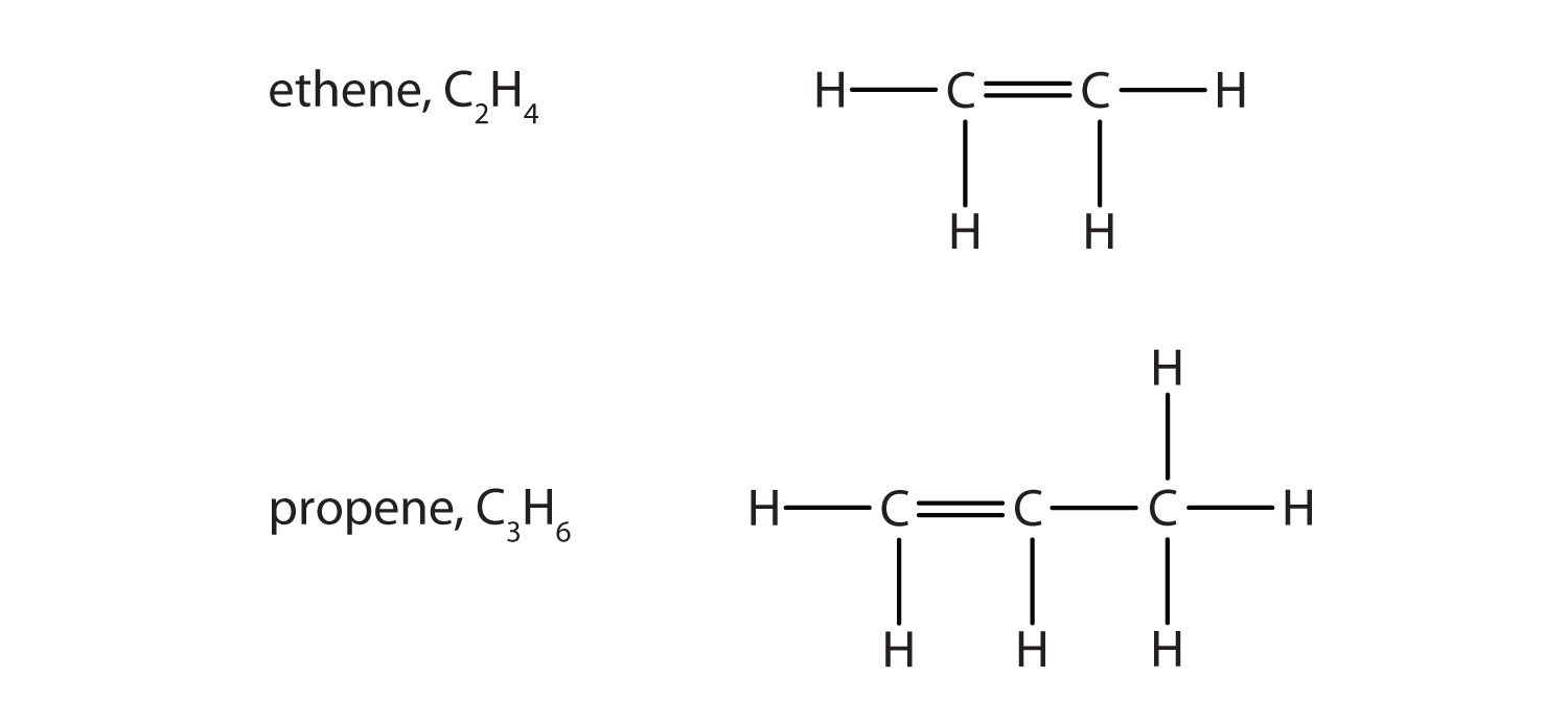 Some hydrocarbons have one or more carbon–carbon double bonds (denoted C=C). These hydrocarbons are called alkenesA hydrocarbon with one or more carbon–carbon double bonds.. Figure 4.7 "Formulas and Molecular Models of the Two Simplest Alkenes" shows the formulas and the molecular models of the two simplest alkenes. Note that the names of alkenes have the same stem as the alkane with the same number of carbon atoms in its chain but have the ending -ene. Thus, ethene is an alkene with two carbon atoms per molecule, and propene is a compound with three carbon atoms and one double bond.