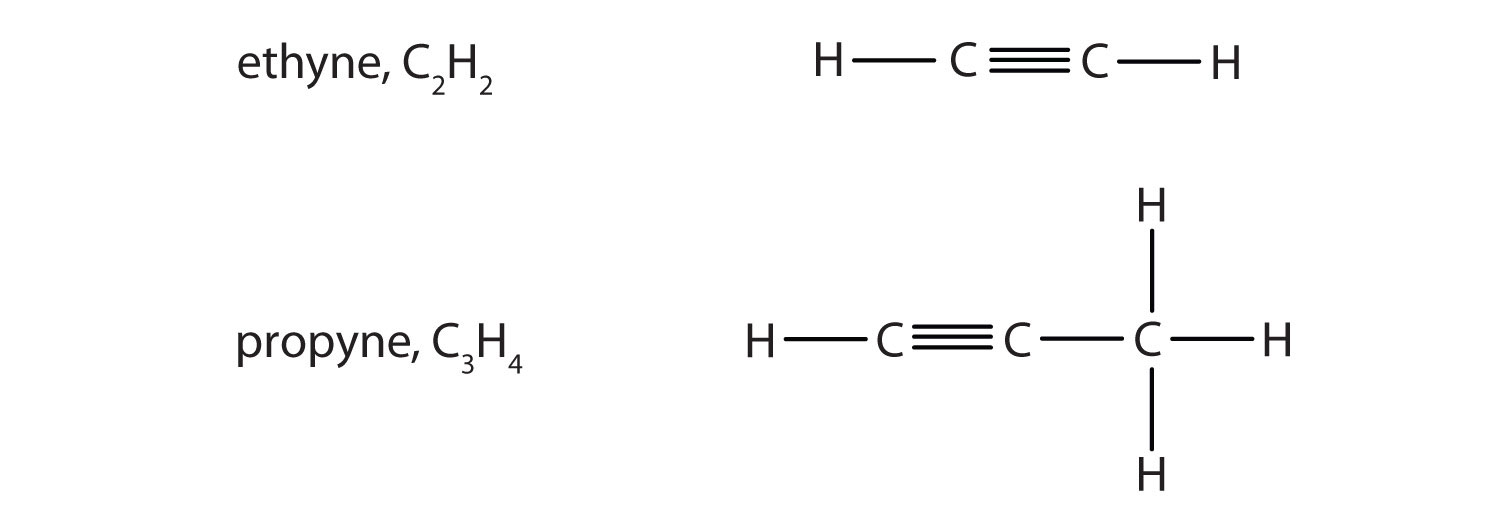AlkynesA hydrocarbon with a carbon–carbon triple bond. are hydrocarbons with a carbon–carbon triple bond (denoted C≡C) as part of their carbon skeleton. Figure 4.8 "Formulas and Molecular Models of the Two Simplest Alkynes" shows the formulas and the molecular models of the two simplest alkynes and their systematic names. The names for alkynes have the same stems as for alkanes but with the ending -yne. (For more information about alkenes and alkynes, see Chapter 13 "Unsaturated and Aromatic Hydrocarbons".)