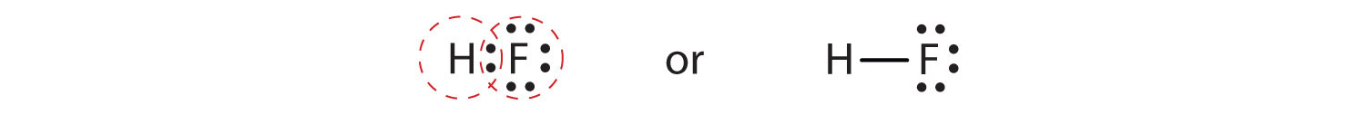In this molecule, the hydrogen atom does not have nonbonding electrons, while the fluorine atom has six nonbonding electrons (three lone electron pairs). The circles show how the valence electron shells are filled for both atoms.
