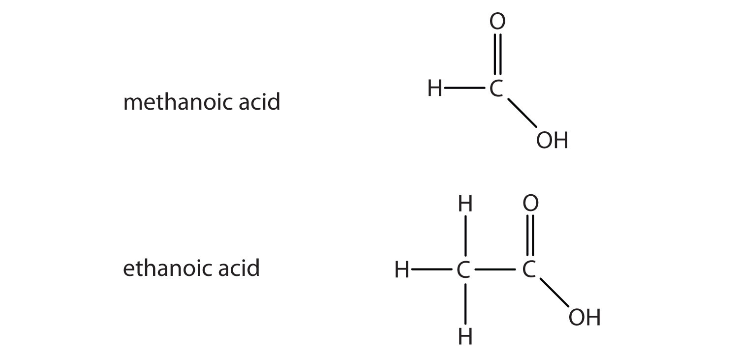The two smallest carboxylic acids are formic acid (found in the stingers of ants) and acetic acid (found in vinegar).